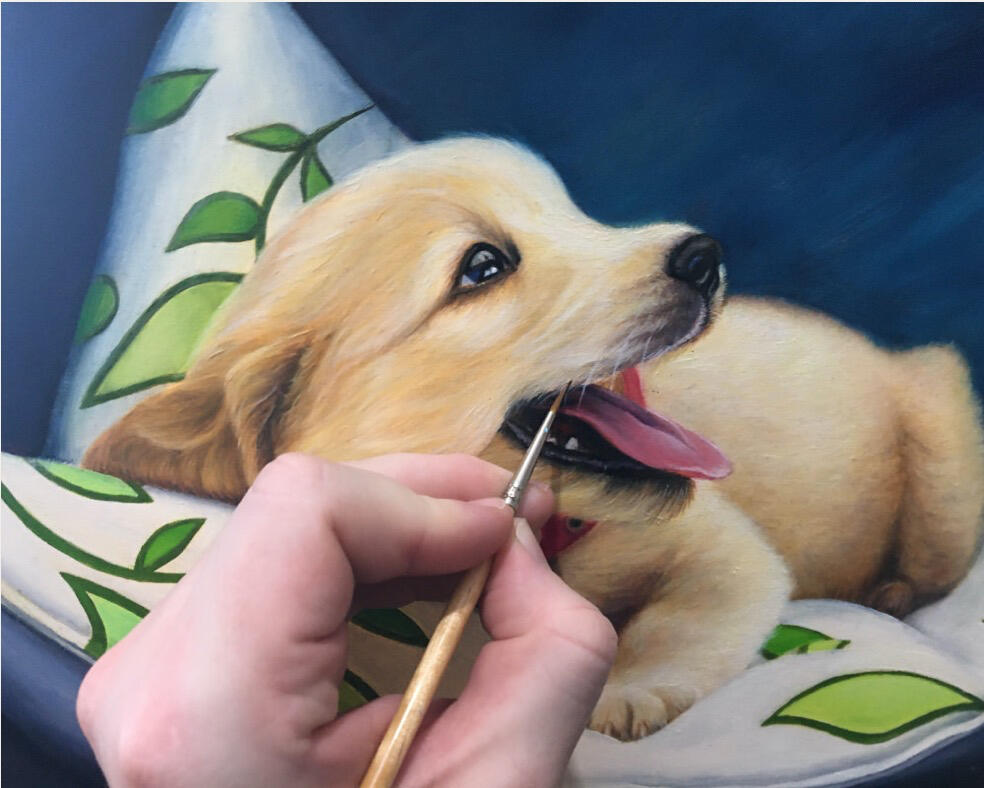 Two weeks before I am scheduled to begin your painting, I will contact you to confirm everything with you. I will then begin meticulously painting your dog, from initial background brush strokes to the detail in the whiskers, to the final layer of varnish. Once complete, I will email you a photo of the painting. This is when you can request any tweaks if needed, only when you are happy will I sign my name.